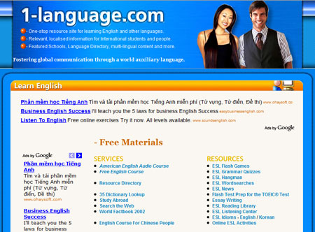 Đây là trang web chuyên hỗ trợ học tiếng Anh và một số ngôn ngữ khác. Tại đây bạn sẽ tìm được những khóa học miễn phí như: Luyện nghe – nói tiếng Anh của người Mỹ (gồm 40 bài từ cấp độ thấp đến cao), các khóa ngữ pháp tiếng Anh (gồm 70 bài, chia thành 4 cấp độ từ Starter đến Upper Intermediate). 1-language.com cung cấp cho người dùng bộ từ điển trực tuyến hỗ trợ 35 thứ tiếng khác nhau, trong đó có tiếng Việt.