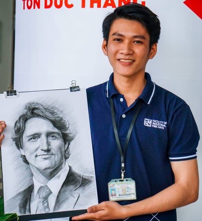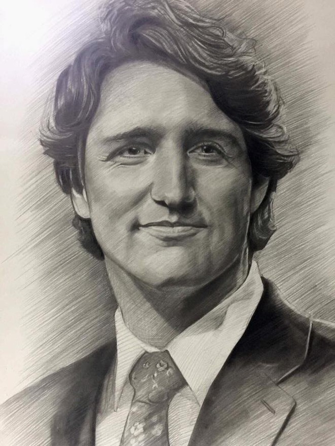 Đặc biệt hơn, Hậu còn có một món quà gửi đến ngài Justin Trudeau, đó là bức tranh chân dung truyền thần được chàng sinh viên vẽ trong vòng 8 tiếng liền. Tác phẩm được hoàn thành với chất liệu chì và bột than.