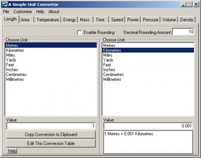 A Simple Unit Converter là chương trình sắp xếp đề mục theo từng loại như diện tích, độ dài, khối lượng, thể tích, thời gian, nhiệt độ... Cách sử dụng rất đơn giản, bạn chỉ cần nhập giá trị cần chuyển đổi, chọn đơn vị thì chương trình sẽ tự động tính ra kết quả.