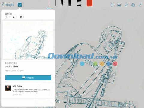 Đăng tác phẩm nghệ thuật của bạn ngay khi còn dang dở trên cộng đồng Behance và nhận phản hồi tức thời về ý tưởng, trực tiếp trên Sketch. Chia sẻ cập nhật dưới dạng các phiên bản sửa đổi mới. Ngoài ra, người dùng cũng có thể chia sẻ với bạn bè trên mạng xã hội Facebook và Twitter.