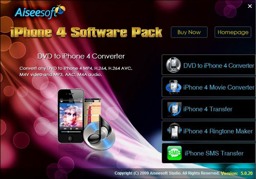 Aiseesoft iPhone 4 Software Pack có chứa tất cả các phần mềm dành cho iPhone 4: DVD to iPhone 4 Converter, iPhone 4 Movie Converter, iPhone 4 Transfer software, iPhone 4 Ringtone Maker, và iPhone SMS Transfer.