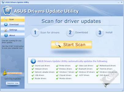 ASUS Drivers Update Utility cập nhật các hệ thống driver cho các thiết bị ASUS của bạn một cách tự động chỉ với một cú nhấp chuột. Nó trước hết sẽ quét hệ thống của bạn sau đó tải về và cài đặt các driver ASUS chính thức để cho thiết bị của bạn làm việc đúng.