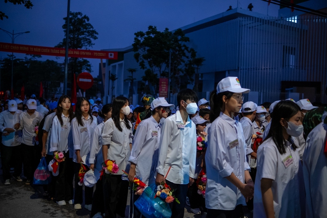 Các em học sinh tham gia diễu hành cũng mặc đồng phục, cầm theo hoa đến khu vực tập trung để ổn định hàng lối từ sáng sớm