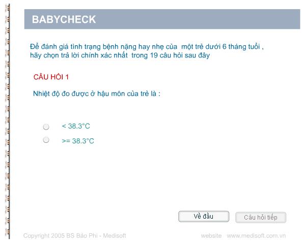 Hệ thống tính điểm BabyCheck được sử dụng ở những nước đang phát triển hoặc ở những phòng khám đông bệnh nhân ngoại trú để đánh giá mức độ bệnh của trẻ em dưới 6 tháng tuổi. Nó có thể giúp phân nhóm những trẻ có nguy cơ cao cần phải chăm sóc đặc biệt, nhóm trẻ bệnh nhẹ và nhóm trẻ khỏe mạnh.