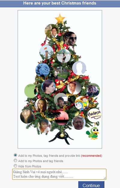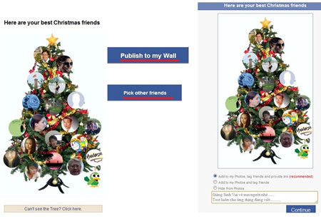 Với tùy chọn Publish to my Wall: tự động tag 1 số ảnh bạn bè lên cây thông Noel để chia sẻ với bạn bè lên tường của bạn. Bấm vào Publish to my Wall, tiếp đến là nhập thông điệp gửi đến bạn bè rồi bấm Continue, bảng pop-up nhỏ cho bạn kiểm tra lại để đăng tải lên Facebook, bấm Publish để chia sẻ.