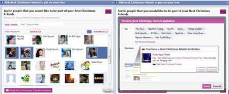 Khi bạn chọn vào đây, nó hiện lên 1 bảng nhỏ cho bạn lựa chọn những bạn bè bạn thích treo lên cây thông, những người này sẽ được bạn thông báo rằng bạn đã thêm người bạn đó lên cây thông Noel. Giới hạn tối đa bạn cần chọn là 12. Hoặc là bạn bấm Skip để bỏ qua bước này.