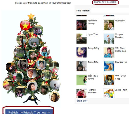 Để thay đổi cây thông Noel này bạn bấm vào dòng liên kết: Change how tree looks. Chọn xong bạn bấm vào nút Publish my Friends Tree now, sau đó bấm tiếp Publish, bấm tiếp Send.