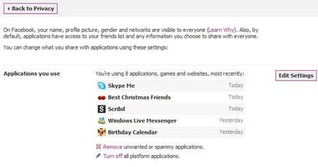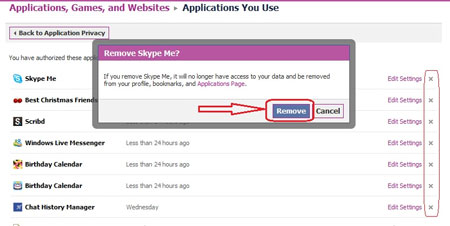Sau đó bấm tiếp vào link chuyển tiếp đến bảng thiết lập. Tiếp theo bạn bấm vào nút Edit Settings tại mục Application Privacy. Tại đâu bạn sẽ thấy các ứng bạn đã thêm vào nằm tại mục này, để gỡ bỏ bạn bấm vào biểu gỡ bỏ nằm bên cạnh nút Edit Settings sau đó bấm Remove để gỡ bỏ ứng dụng ra khỏi Facebook.