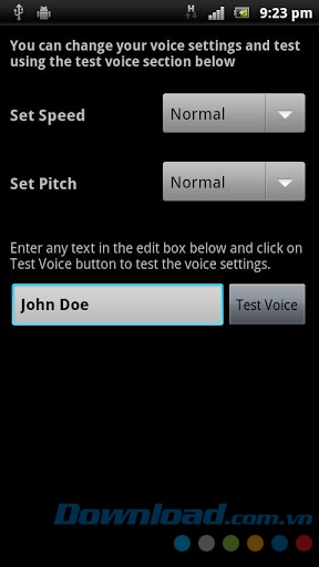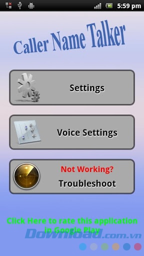 Caller Name Talker sử dụng công cụ chuyển văn bản thành giọng nói được tích hợp sẵn trong Android để phát âm tên của người gọi đến và người gửi tin nhắn SMS. Tuy nhiên, bạn cần phải lưu ý rằng chương trình này sẽ không hoạt động nếu điện thoại của bạn không cài đặt trước công cụ chuyển văn bản thành giọng nói. Không cần phải lo lắng về điều đó. Caller Name Talker sẽ chuyển hướng cho bạn đến Google Play để cài đặt công cụ này vào trong điện thoại bạn nếu điện thoại của bạn chưa cài đặt sẵn nó.