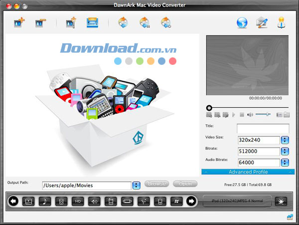 DawnArk Mac Video Converter là một phần mềm chuyển đổi video tuyệt vời cho Mac, nó có thể chuyển đổi giữa nhiều định dạng video và âm thanh với tốc độ chuyển đổi nhanh chóng và chất lượng đầu ra cao. Chương trình hỗ trợ các định dạng như AVI, MP4, MOV, MKV, WMV, DivX, XviD,3GP, 3G2, VOB và HD Video (TS, MTS, M2TS), âm thanh MP3, AAC, và AC3. Ngoài ra, DawnArk Mac Video Converter cũng cho phép bạn trích xuất âm thanh từ file video và chuyển đổi chúng sang đinh dạng phổ biến như MP3, WMA, WAV, AAC, RA, M4A, MP2.