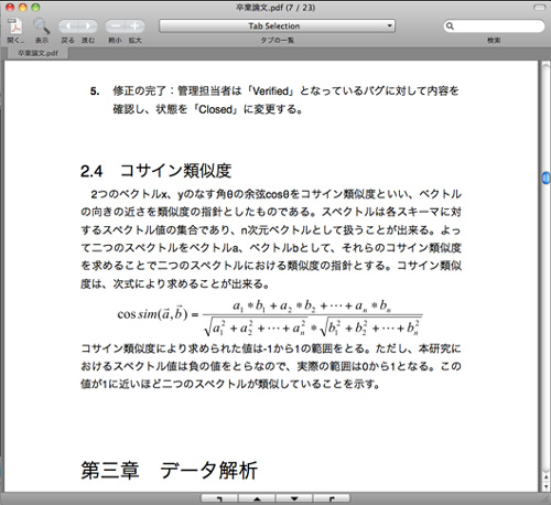 Dioretsa là một chương trình hiển thị PDF có thể quản lý các file PDF với thẻ. Tên file PDF sẽ được hiển thị trên thẻ và tiêu đề cửa sổ. Chương trình này có thể chọn thẻ bằng danh sách thẻ, tìm kiếm một từ từ hộp tìm kiếm và hiển thị outline của file PDF bằng cách sử dụng Dioretsa. Thêm vào đó, tính năng xem toàn màn hình, hiển thị file PDF đang có trong Finder và chuyển giữa các thẻ cũng được hỗ trợ. Khi bạn muốn mở file PDF, bạn có thể thực hiện bằng lệnh, hoặc nhấn nút "open pdf file", kéo và thả file PDF vào icon Dock của Dioretsa hoặc phải chuột vào file rồi chọn Dioretsa tại "open file (pdf only) with...".