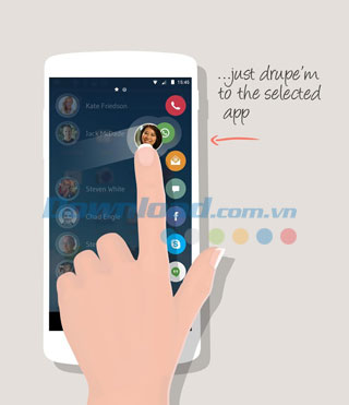 Bạn có thể kéo Drupe từ 2 cạnh của màn hình và nó cho phép bạn thực hiện các tương tác với các liên lạc gần đây hoặc yêu thích với ứng dụng bạn muốn thực hiện. Với drupe, bạn chỉ cần kéo bong bóng của 1 liên lạc tới ứng dụng bạn muốn sử dụng như: Skype, tin nhắn SMS, Zalo, WhatsApp, Viber, bạn có thể làm tất cả những điều này thông qua một ứng dụng đơn giản.