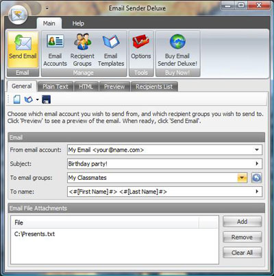 Sử dụng Email Sender Deluxe sẽ làm cho công việc hàng ngày này của bạn trở nên dễ dàng hơn rất nhiều. Chỉ với thao tác chọn danh sách người nhận, soạn thư và click vào nút Send!.
