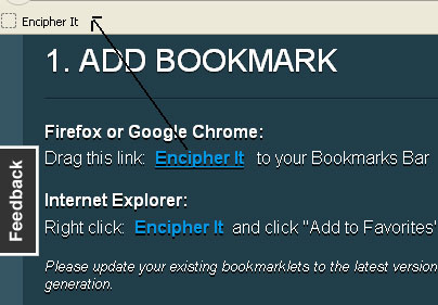 Đối với Firefox và Google Chrome, bạn chỉ việc click chọn liên kết Encripher It đồng thời kéo và thả vào thanh Bookmark. Đối với Enternet Explorer bạn phải click chuột phải vào liên kết này rồi chọn Add to Favorites.
