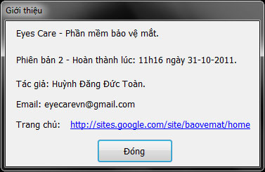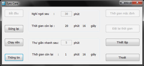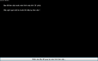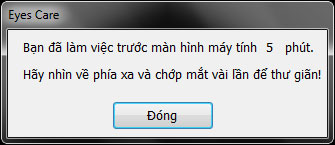 Eyes Care là phần mềm hỗ trợ bảo vệ mắt cho những người phải thường xuyên làm việc với máy tính. Eyes Care sẽ tự động nhắc nhửo người sử dụng máy tính nghỉ ngơi sau một khoảng thời gian nhất định.