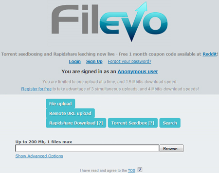 Filevo là chương trình trực tuyến để lưu trữ và chia sẻ tập tin miễn phí. Sau khi truy cập địa chỉ trên, người dùng sẽ được cung cấp 2 chế độ miễn phí: Anonymous (vô danh) và Free Registered (đăng ký miễn phí).