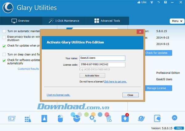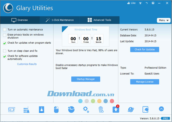 Glary Utilities Pro cung cấp một dịch vụ chăm sóc máy tính all-in-one và tự động chỉ bằng một cú nhấp chuột. Thông qua đó, nó sẽ quét PC để tìm ra các vấn đề sau một cách nhanh chóng như: phím registry không hợp lệ, phím tắt bị hỏng, mục khởi động không cần thiết, tập tin rác, lịch sử duyệt Internet và spyware. Sau đó, với cú nhấp chuột thứ hai vào tùy chọn "Repair Problems", bạn có thể tăng tốc hiệu suất cho hệ thống một cách đáng kể. One-click Maintenance sẽ giúp bạn dễ dàng tối ưu hóa hệ thống và không làm phiền bạn với nhiều bước thao tác.