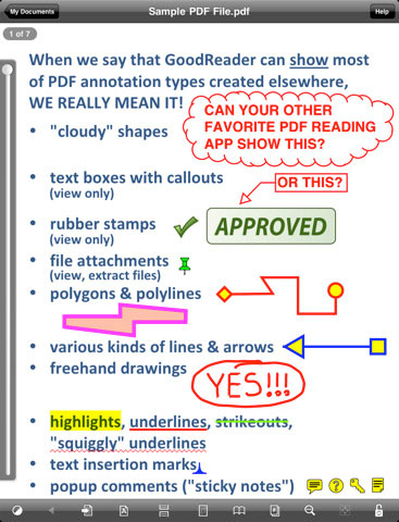 GoodReader có thể là phần mềm đáng giá nhất mà bạn đầu tư cho iPad. Được cho là phần mềm ảo thuật, bạn có thể hiển thị file PDF và hàng ngàn định dạng dữ liệu khác, bao gồm Microsoft Office, HTML, file ảnh cũng như file định dạng video, audio. Không chỉ vậy, bạn còn có thể kết nối tới một số dịch vụ lưu trữ đám mây phổ biến như Dropbox (có ứng dụng hiển thị riêng nhưng không bằng GooReader), máy chủ WebDAV và truy cập trực tiếp các file được lưu trữ trên Google Docs và trong Gmail.