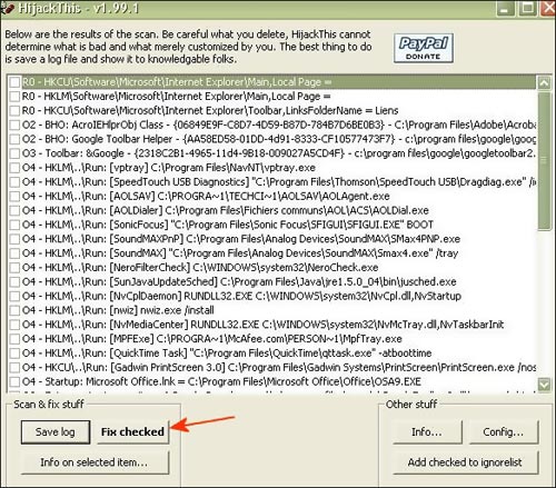 Cho dù bạn khởi động theo kiểu nào thì HijackThis có thể vẫn mang đến nhầm lẫn cho bạn. Tất cả điều bạn cần làm là kích vào nút Scan để tiến hành quét máy. Chương trình sẽ kiểm tra và đưa ra danh sách tất cả các điểm vào đáng ngờ trên thanh ghi hay trên máy tính của bạn. Với một máy hoàn toàn khoẻ mạnh thì riêng việc thiết lập trang chủ mới cho Internet Explorer cũng có cả tá điểm vào. Chúng tôi đã thử và nhận được kết quả từ một lần quét máy là có tới là 44 điểm vào. Điều đáng chú ý là tất cả đều là vô hại. (Nếu bạn muốn có nhiều thông tin, hãy chọn hộp check box, kích vào phần Info trên nút Selected Item hoặc tra cứu từ các bản ghi hướng dẫn log của nhà sản xuất). Tốt nhất là ghi lại các bản log ở thư mục HijackThis folder và tìm câu trả lời trên Internet.