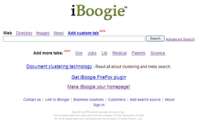 Có thể nói phương thức tìm kiếm của iBoogie là quá mở rộng. iBoogie cung cấp cho bạn kết quả trả về như Web, Directory, Images và News...vv. Sau khi bạn đưa ra từ khoá, iBoogie trả về cho bạn rất nhiều chủ đề liên quan. Đặc biệt, bên góc trái cửa sổ làm việc của bạn, iBoogie trả về cho bạn những kết quả được xem là “gần gũi” nhất với từ khoá bạn đưa ra.