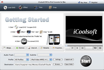 iCoolsoft DVD to iPod Converter for Mac là một phần mềm chuyển đổi DVD sang iPod một cách chuyên nghiệp và mạnh mẽ. Công cụ này giúp người dùng máy Mac có thể rip phim DVD để xem trên iPod. DVD to iPod Converter for có thể tách và chuyển đổi DVD sang MP4, MPEG-4, H.264, MOV, M4V video và MP3, M4A, AAC cho iPod nano, iPod touch, iPhone…