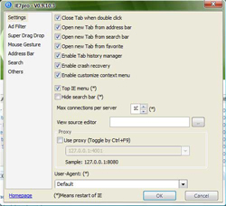 Crash Recovery: Chức năng tương tự với FireFox này sẽ giúp tự động mở lại các thẻ đang duyệt khi giai đoạn duyệt web bị trục trặc làm gián đoạn và bị buộc phải đóng IE. Vào Preferences - Settings - Enable Crash Recovery để kích hoạt.