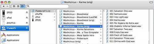 Khi sử dụng iTunesFS, một file hệ thống FUSEObjC dành cho Mac, sẽ giúp tất cả danh sách chơi nhạc của iTunes có trong Finder. Và không chỉ có vậy, phiên bản 1.1 còn thêm hỗ trợ dành cho iPod theo cách tương tự.