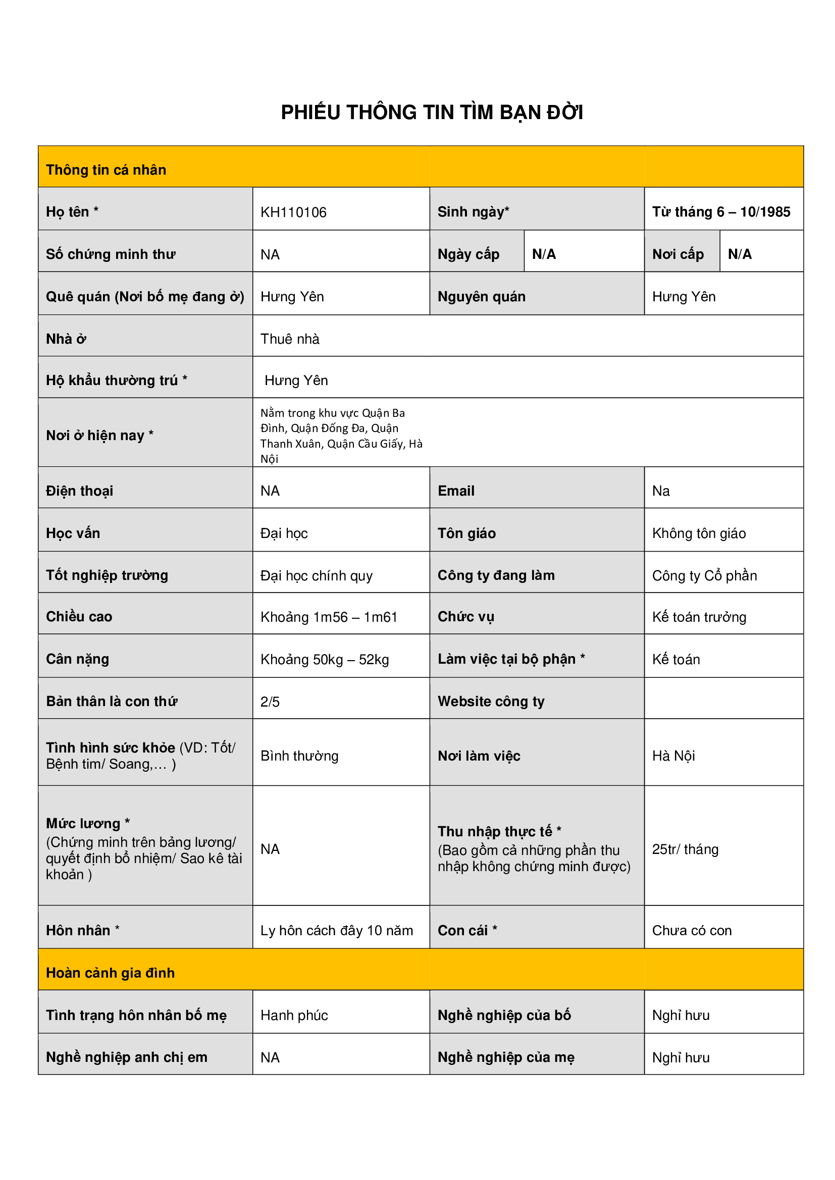 A* CHI TIẾT HỒ SƠ tìm bạn bốn phương 1. Thông tin cá nhân • Họ tên: KH110106 • Ngày sinh: Từ tháng 6 – 10/1985 • Số CMND/CCCD: N/A • Ngày cấp: N/A • Nơi cấp: N/A • Quê quán (nơi bố mẹ đang ở): Hưng Yên • Nguyên quán: Hưng Yên • Hộ khẩu thường trú: Hưng Yên • Nơi ở hiện nay: Khu vực các quận Ba Đình, Đống Đa, Thanh Xuân, Cầu Giấy, Hà Nội • Nhà ở: Thuê nhà • Điện thoại: N/A • Email: N/A 2. Học vấn – Nghề nghiệp • Trình độ học vấn: Đại học chính quy • Tôn giáo: Không • Nơi làm việc: Hà Nội • Công ty đang làm: Công ty Cổ phần • Bộ phận: Kế toán • Chức vụ: Kế toán trưởng 3. Thông tin cá nhân khác • Chiều cao: Khoảng 1m56 – 1m61 • Cân nặng: Khoảng 50kg – 52kg • Sức khỏe: Bình thường • Là con thứ: 2/5 4. Thu nhập • Thu nhập thực tế: Khoảng 25 triệu/tháng • Mức lương chứng minh: N/A 5. Tình trạng hôn nhân • Hôn nhân: Ly hôn cách đây 10 năm • Con cái: Chưa có con 6. Hoàn cảnh gia đình • Tình trạng hôn nhân của bố mẹ: Hạnh phúc • Nghề nghiệp của bố: Nghỉ hưu (sinh năm 1958) • Nghề nghiệp của mẹ: Nghỉ hưu (sinh năm 1958) • Sức khỏe bố mẹ: Bình thường 7. Anh chị em • Năm sinh: 1983, 1986, 1988, 1991 • Tình trạng hôn nhân: Đã kết hôn • Tình trạng con cái: Đã có con N/A 8. Thông tin khác • Kinh tế gia đình: N/A • Dự kiến nơi ở sau kết hôn: Ưu tiên tại Hà Nội**