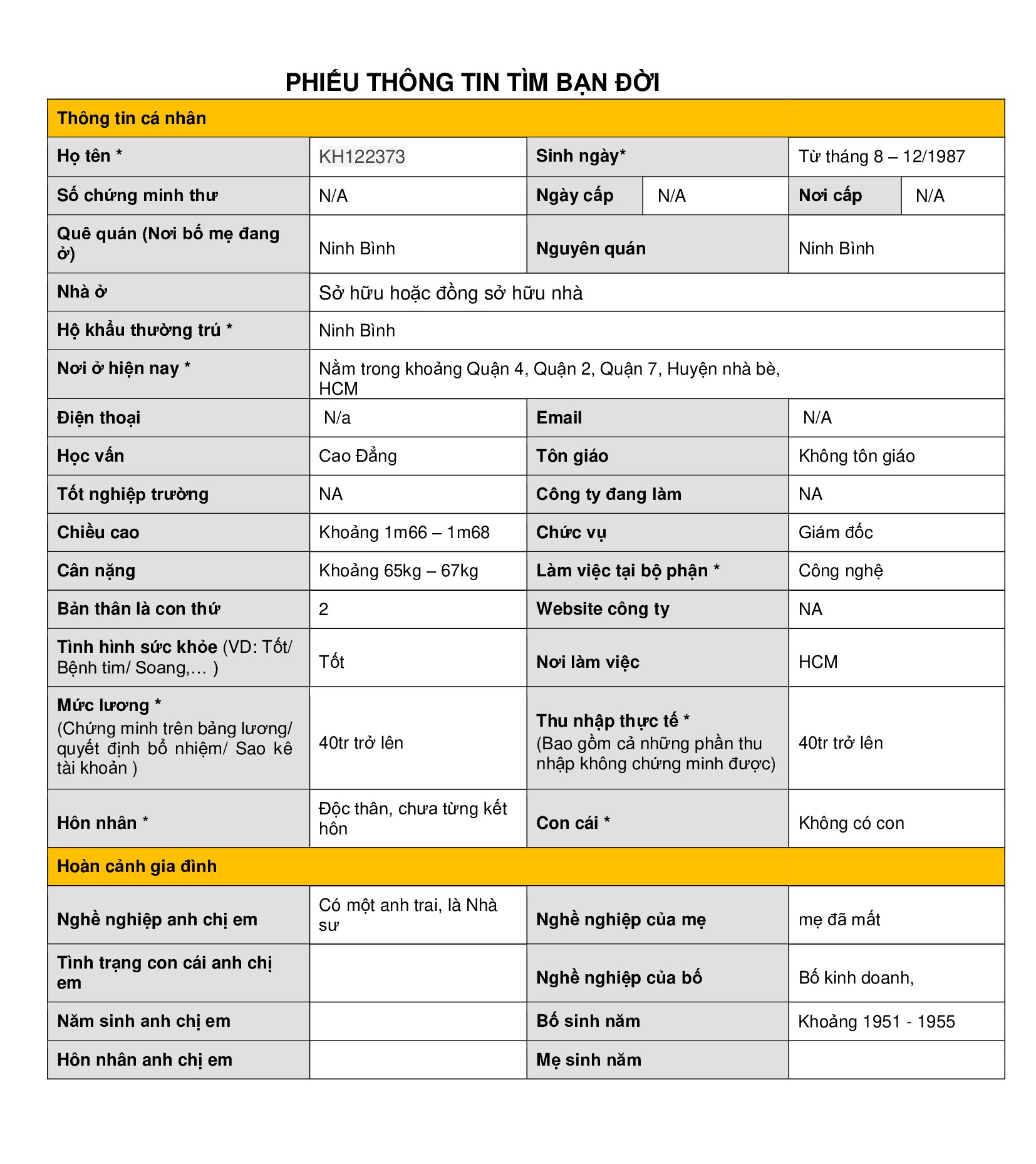 KH122373 | Nam giới 1987 Hồ Chí Minh Tìm Vợ | M26-TT45 | 9.000.000 đ Tình yêu