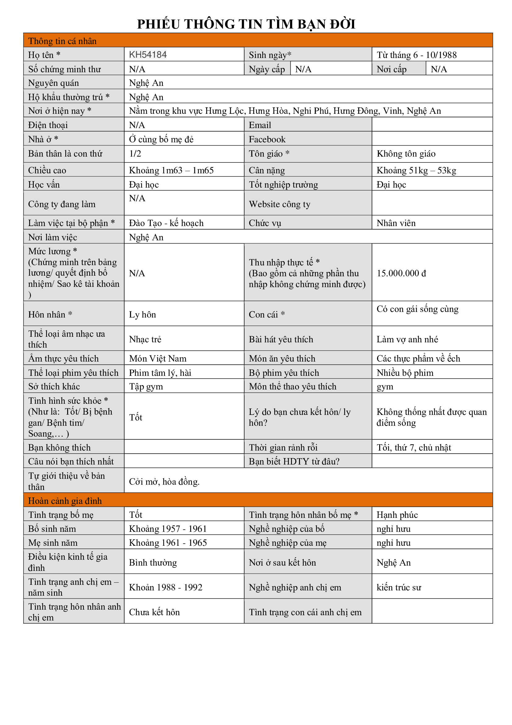 KH54184 | Nữ giới 1988 Nghệ An tìm mối quan hệ lâu dài | M26-TT45 | 5.000.000 đ tìm chồng