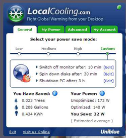 Ngay sau khi vừa cài đặt Local Cooling, chương trình sẽ nằm thường trú dưới khay hệ thống máy tính. Click chuột vào biểu tượng của chương trình tại khay hệ thống, một bảng hộp thoại thông báo rằng hệ thống của bạn đã được tiết kiệm bao nhiêu KWh điện năng trong suốt quá trình sử dụng máy tính. Để tìm hiểu hết các ưu điểm của chương trình và tinh chỉnh một môi trường làm việc thật sự tiết kiệm điện, bạn nhấn vào tùy chọn Settings trong cửa sổ vừa xuất hiện.