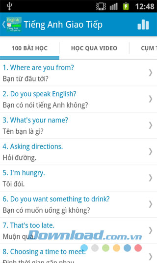 Luyện nghe tiếng Anh giao tiếp là phần mềm giúp rèn luyện kỹ năng nghe một cách hoàn thiện hơn. Đây là phần mềm học tiếng Anh tốt nhất trên Android, có đầy đủ những đoạn hội thoại từ cơ bản đến nâng cao, có phát âm, có bản dịch đầy đủ. Có thể sử dụng mà không cần kết nối mạng.