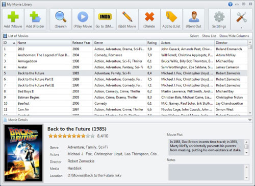 Nếu máy tính của bạn có hàng trăm bộ phim và bạn muốn quản lý chúng một cách chuyên nghiệp thì My Movie Library 1.0.1055 là phần mềm đáng để bạn lựa chọn. My Movie Library sẽ tự động quét các thông tin về bộ phim trên máy tính bằng cách thêm các thư mục chức phim đã định sẵn, ngoài ra, bạn cũng có thể thêm các thông tin vào để dễ dàng quản lý hơn. Các bộ phim được quản lý bằng phần mềm này có thể chơi trực tiếp bằng cách nhấn đúp chuột và xem.