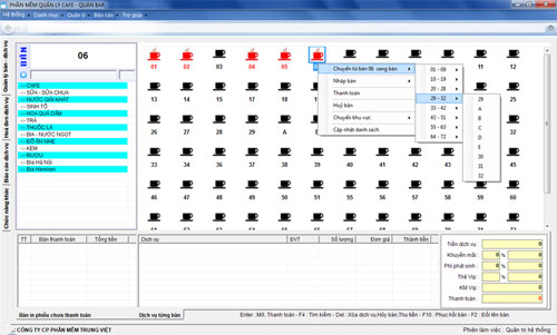 TVSCF - Phần mềm quản lý sử dụng cho các Quán Bar, Cafe, nhà hàng với đặc trưng quản lý nổi bật là quản lý dịch vụ theo bàn, theo khu vực, theo thời gian và theo đối tượng. TVSCF với giao diện trực quan, thân thiện giúp cho người quản lý dễ dàng trong việc phục vụ món, chuyển đổi bàn, chuyên đổi khu vực và tính tiền dịch vụ :