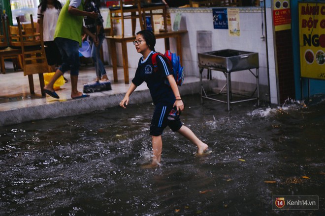 Nước ngập sâu tới đầu gối người lớn nên các bậc phụ huynh không dám để con lội nước vì sợ con bị té xuống cống mỗi khi có xe đi qua tạo sóng.