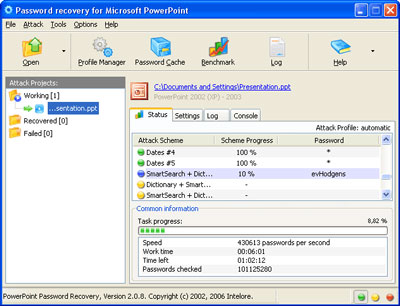 PowerPoint Password Recovery hỗ trợ phục hồi mật khẩu cho các file PPT, PPS (PowePoint Show), PPA (PowerPoint Add-In) và POT (PowerPoit Template) được soạn bằng mọi version của Microsoft PowerPoint. Điều đặc biệt là chương trình hỗ trợ tới 31 bộ từ điển, các kí hiệu đặc biệt, các dạng thức ngày, tháng, viết hoa, viết thường, dùng ngoại ngữ... thường được sử dụng để làm mật khẩu cho file PowerPoint, để tìm mật khẩu, chương trình sẽ dùng lần lượt các bộ từ điển này áp dụng vào file trong thời gian ngắn nhất có thể.