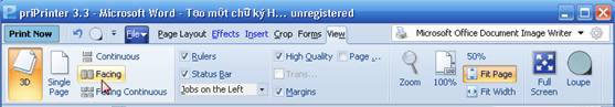 Sau khi cài đặt xong, priPrinter sẽ tự động tích hợp một máy in ảo vào chức năng Print của Windows. Để tùy biến bản in với priPrinter, bạn chỉ cần mở file cần in lên. Sau đó bấm nút Ctrl+P rồi chọn tên máy in là priPrinter, rồi bấm nút OK để truy cập vào giao diện làm việc của chương trình. Vào giao diện chính của priPrinter từ trái sang phải ta có các công cụ sau: