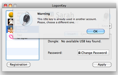 LogonKey sẽ biến thiết bị USB của bạn trở thành thiết bị quản lý mật khẩu xách tay khi nó biến key bảo mật USB như một giải pháp xác nhận. Thiết bị hộp an toàn USB này sẽ cung cấp cho bạn một mã truy cập độc để loại trừ khả năng rò rỉ thông tin không hợp pháp. Phần mềm này sẽ giúp bạn hạn chế truy cập vào hệ thống Mac của bạn và cung cấp quản lý từ xa đáng tin cậy qua cơ sở dữ liệu cá nhân của bạn. Với bảo mật USB, bạn sẽ không phải nhớ mật khẩu phức tạp trong đầu và điền chúng từ bàn phím, thủ tục đăng nhập sẽ được giảm thiểu bằng cách cắm ổ USB vào hệ thống. Cho dù dung lượng lưu trữ của USB là bao nhiêu đi chăng nữa, nó vẫn không phải là vấn đề bởi số serial của USB chính là mật khẩu USB và xác nhận người dùng. Thậm chí, ngay cả khi thiết bị của bạn bị mất, LogonKey có một giải pháp để thay thế số đã mất, chỉ cần điền mật khẩu tài khoản và chọn một Key khác trong cửa sổ chính của LogonKey.