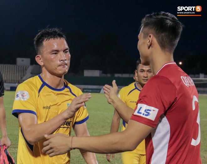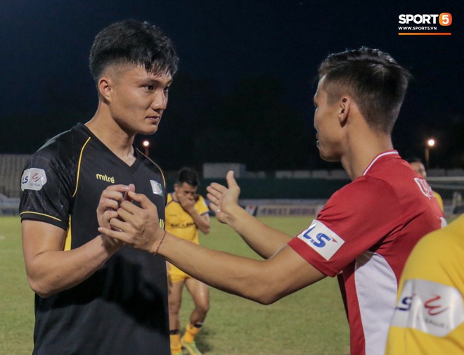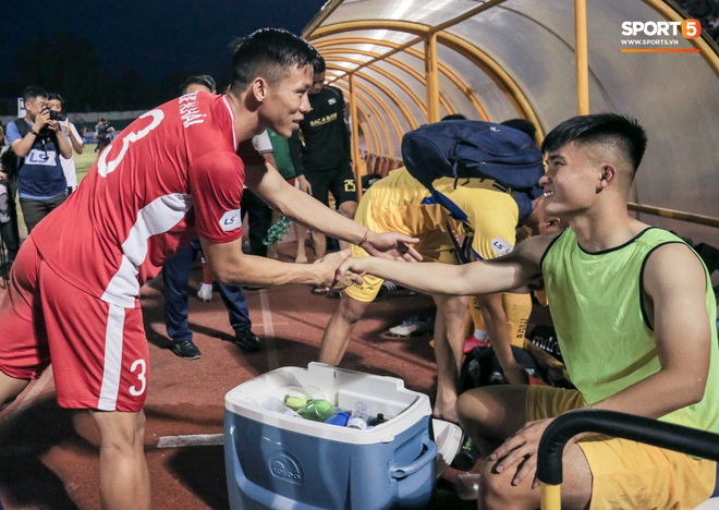 Quế Ngọc Hải chủ động bắt tay Hồ Tuấn Tài. Tiền đạo sinh năm 1995 thể hiện gương mặt nghiêm túc, buông lời trêu đàn anh: "Ai bảo đá chân tôi cho lắm vào. Ông đá vào chân tôi hơi bị đau đấy".