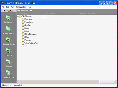 Các chức năng chính của chương trình gồm có File Shortcut (hiển thị cây thư mục và tất cả các shortcut truy xuất file có trong thư mục con), Folder Shortcut (hiển thị shortcut của folder), Last 20 (hiển thị 20 shortcut/bookmark mới tạo hay kích hoạt), Scan IE Windows (chụp lại tiêu đề trang web và URL của tất cả cửa sổ IE đang mở), Scan Driver (scan ổ USB để tìm kiếm file) v.v... Ngoài ra, pop-up menu ở khay hệ thống cho phép bạn kích hoạt file trong ổ đĩa USB một cách nhanh chóng. Đặc biệt, giao diện chương trình có thể thay đổi theo 8 kiểu khác nhau, trong đó kiểu Green Light là ấn tượng nhất. Với sự trợ giúp của Remora USB Quick Launch Pro, hiệu suất làm việc của ổ đĩa USB sẽ tăng lên đáng kể.