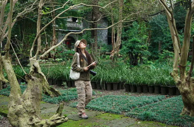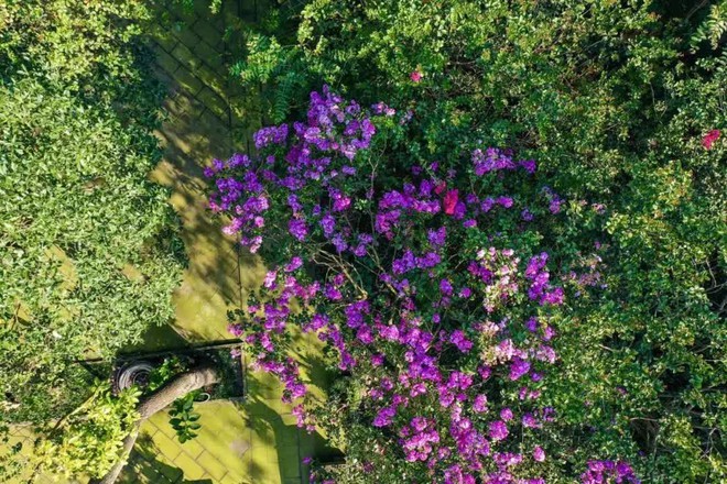 Bên cạnh quán trà có một bên là tòa nhà cổ kính và một bên là phòng tắm nắng. Khi bước vào cửa, mọi người có thể nhìn thấy một hòn non bộ được trồng cây khiến nó trở nên hoang dã hơn.