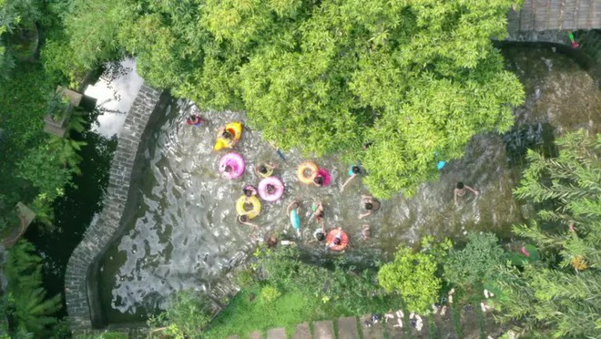 Bên ngoài quán trà, bố của Liao Quanfu đã xây một bể bơi rất mát.