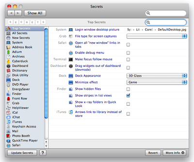 Chương trình miễn phí này thu thập các thiết lập của Snow Leopard và thay đổi sao cho nó dễ hiểu và dễ sử dụng nhất. Từ nay bạn chỉ phải đánh dấu hoặc lựa chọn trong các cửa sổ xổ xuống mà không phải tốn công mày mò nữa. Secrets tích hợp thiết lập của hơn 40 chương trình, từ Mail, iCal, iChat, Finder, Front Row, Keynote... cho đến các chương trình của bên thứ 3 như Adium, Audio Hijack Pro, BBedit, EyeTV, WMware, Fusion hay TextMate. Tuy nhiên thì 1 số có rất nhiều thiết lập trong khi số còn lại chỉ có 1 hay 2 cái. Theo tinhte