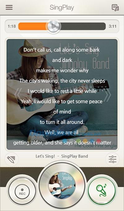 Nhấn nút REC để ghi âm phần biểu diễn của bạn. Quy trình ghi âm sẽ bắt đầu sau quy trình tối ưu hóa hệ thống đơn giản của SingPlay. Nhấn lại nút REC để dừng ghi âm. Nhấn hình ảnh đĩa CD để điều khiển phát nhạc hoặc tạm dừng.