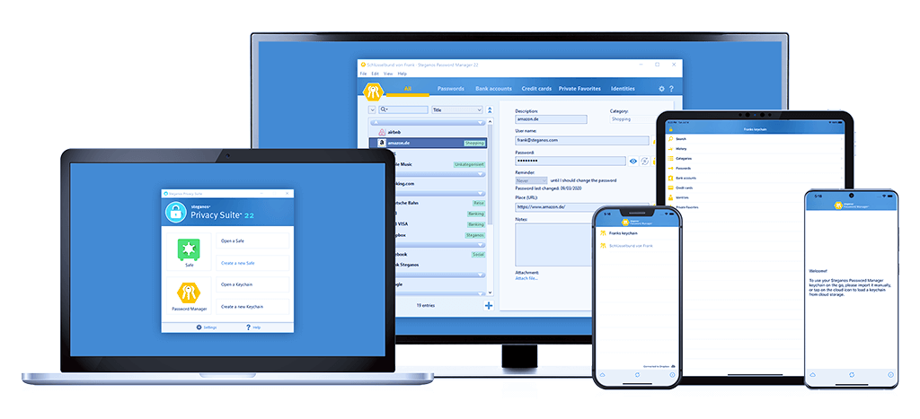 Steganos® Privacy Suite ™ 21 kết hợp các sản phẩm phần mềm Steganos Security từng đoạt giải thưởng Steganos® Safe ™ và Steganos® Password Manager ™. Người dùng có thể mã hóa dữ liệu nhạy cảm như báo cáo kinh doanh, danh sách TAN hoặc ảnh cá nhân nhờ điều hướng menu rõ ràng và dễ dàng - trên PC, mạng nội bộ và đám mây. Mật khẩu cho tất cả các tài khoản trực tuyến có thể được tạo tự động và dễ dàng quản lý và quản trị, bất kể đó là trên máy tính, điện thoại thông minh hay máy tính bảng.