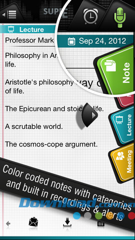 Super Note for iOS hỗ trợ người dùng tạo ghi chú cực nhanh và tạo ghi âm giọng nói trong cùng thời điểm. Các ghi chú này được mã hóa bằng màu vì vậy người dùng có thể tìm chúng tức thời, cũng như có thể vuốt qua để đi từ ghi chú này sang ghi chú khác. Ngoài ra, bạn có thể thiết lập trình nhắc âm báo trên từng ghi chú và thay đổi màu ghi chú / nhóm bất kỳ lúc nào.