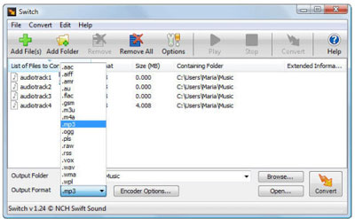 Switch là 1 phần mềm chuyển đổi các định dạng âm thanh. Nó có thể chuyển đổi các tập tin âm thanh từ các định dạng khác nhau sang các tập tin mp3 hoặc wav , hay wav sang mp3 , au sang mp3 , aiff sang mp3 .v.v...