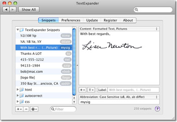 TextExpander là một công cụ gõ tắt có thể tùy chỉnh được giúp người dùng tiết kiệm thời gian và các động tác gõ phím. Với chương trình này bạn có thể định nghĩa chữ viết tắt cho các đoạn trích văn bản và hình ảnh thường xuyên được sử dụng. Khi một chữ viết tắt đánh vào, nó sẽ mở rộng đến đoạn đầy đủ một cách tự động.