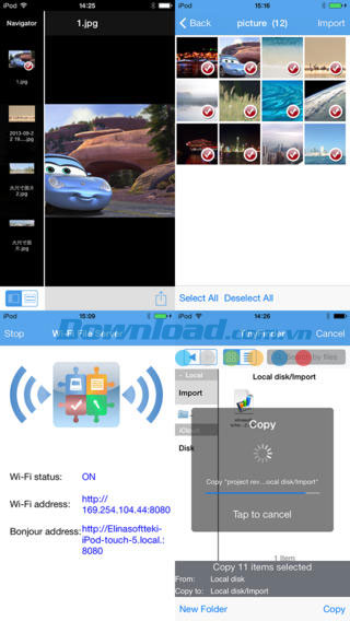 Người dùng có thể truy cập vào thiết bị di động của mình từ máy tính cá nhân hay thiết bị bất kỳ thông qua kết nối không dây WiFi hoặc bằng trình duyệt bất kỳ, sau đó tải xuống và tải lên tệp tin. Hỗ trợ địa chỉ IP và truy cập tên thiết bị Bonjour.