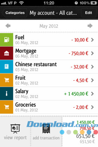 - Xem danh sách giao dịch theo tuần, tháng, năm hoặc toàn bộ.